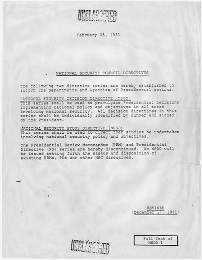 | Keywords: National Security Council Directives - NARA - 198167.tif Scope and content General notes 198167 Local identifier President 1981-1989 Reagan National Security Council 1981 - 1989 Ronald Reagan Library NLRR 40 Presidential Drive Simi Valley CA 93065-0600 1981-02-25 Record group Collection RR-NSC Numbered National Security Policy Papers 1981 - 1989 Record group ARC 1189 National Security Decision Directives compiled 02/25/1981 - 01/19/1989 Series ARC 198166 File unit File unit ARC Variant control numbers NAIL Control Number NLS-NSC-NSDD-1 yes Other versions <gallery> File National_Security_Council_Directives_-_NARA_-_198167 tif tif File National_Security_Council_Directives_-_NARA_-_198167 jpg jpg </gallery> NARA-cooperation PD-USGov Presidential Decision Directives Reagan NARA TIF images with categorized JPGs |