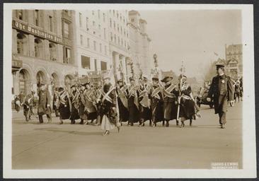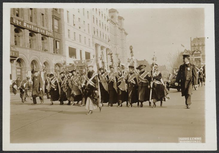 | Keywords: National suffrage demonstration 160078v.jpg  Photograph of suffragists in sashes marching down the street past The Washington Post building flanked by policemen Title derived by Library of Congress staff 1 photograph print 5 x 7 in accession number Call Number Location National Woman's Party Records Group I Container I 160 Folder Suffrage Parade May 9 1914 Source Collection Records of the National Woman's Party institution Library of Congress Manuscript Division http //hdl loc gov/loc mss/mnwp 160078 PD-Harris-Ewing Suffragettes May 1914 in Washington D C Demonstrations and protests in Washington D C |