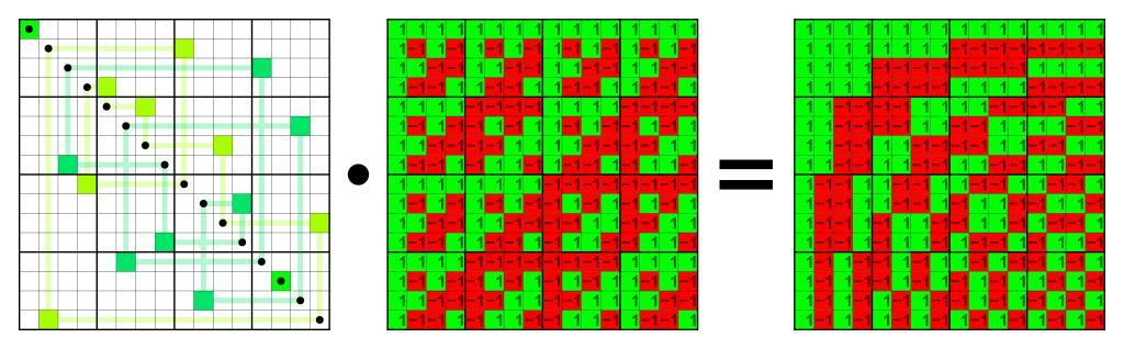| Keywords: Natural and sequency ordered Walsh 16.svg Permutation of the natural ordered Hadamard matrix into the sequency ordered Hadamard matrix of order 16 The former is usually referred to as Walsh matrix but sometimes also the latter The number of sign changes per row in the natural ordered matrix is <math>wp 15 7 3 1 ~ ~ 0 15 ~~7 8 ~~3 12 ~~4 11 ~~1 14 ~~6 9 ~~2 13 ~~5 10 </math> <br> in the sequency ordered matrix the number of sign changes is consequtive The permutation is the product of the Gray code permutation and the Bit-reversal permutation 500px own Mate2code Matrix multiplication Permutation matrices of 4-bit Walsh permutations Walsh matrix of order 16; sequency ordered Order theory |
