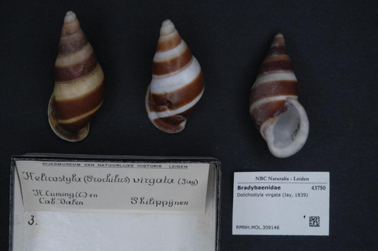 | Keywords: Naturalis Biodiversity Center - RMNH.MOL.309146 - Dolichostyla virgata (Jay, 1839) - Bradybaenidae - Mollusc shell.jpeg artwork Dimensions artwork Document type Bradybaenidae Dolichostyla Individual count Infraspecific epithet Infraspecific rank Institution Naturalis Kind of unit artwork Kind of unit specimen shell Life stage Medium artwork Nomenclatural code Source institute Rijksmuseum van Natuurlijke Historie Leiden Scale the width of the text on the species/QR-code label is 38 mm Occurrence ID page Other fields Other versions artwork Permission license Naturalis donation CC-0 Mollusca Publication location Scientific name Dolichostyla virgata Jay 1839 Scientific name authorship Jay 1839 Source url http //bioportal naturalis nl Specific epithet virgata State or province Subject keywords artwork Subject keywords publication Title artwork Title publication Type status Uploaded with GWToolset Naturalis_Biodiversity_Center_-_RMNH MOL 309146_-_Dolichostyla_virgata_ Jay _1839 _-_Bradybaenidae_-_Mollusc_shell http //medialib naturalis nl/file/id/RMNH MOL 309146/format/large Media donated by Naturalis Biodiversity Center Molluscs at Naturalis from the Rijksmuseum van Natuurlijke Historie Dolichostyla virgata Dolichostyla |