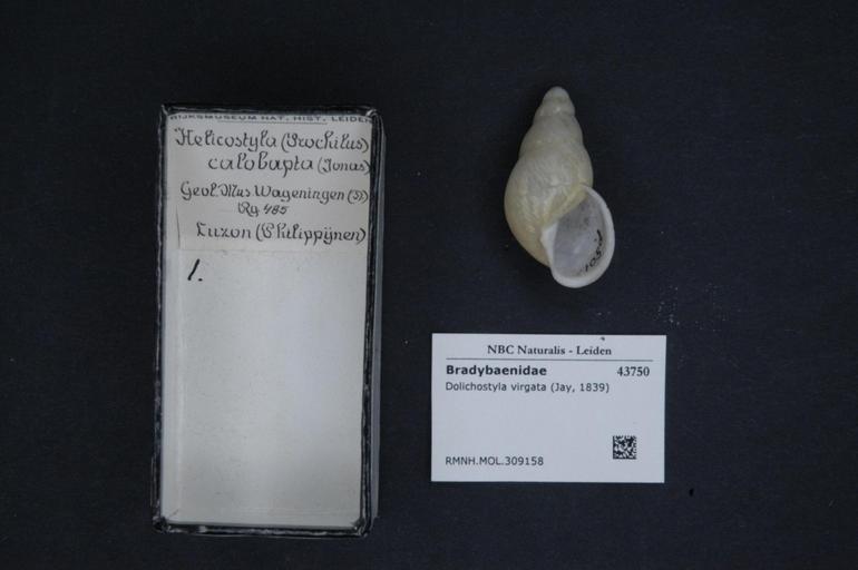 | Keywords: Naturalis Biodiversity Center - RMNH.MOL.309158 - Dolichostyla virgata (Jay, 1839) - Bradybaenidae - Mollusc shell.jpeg artwork Dimensions artwork Document type Bradybaenidae Dolichostyla Individual count Infraspecific epithet Infraspecific rank Institution Naturalis Kind of unit artwork Kind of unit specimen shell Life stage Medium artwork Nomenclatural code Source institute Rijksmuseum van Natuurlijke Historie Leiden Scale the width of the text on the species/QR-code label is 38 mm Occurrence ID page Other fields Other versions artwork Permission license Naturalis donation CC-0 Mollusca Publication location Scientific name Dolichostyla virgata Jay 1839 Scientific name authorship Jay 1839 Source url http //bioportal naturalis nl Specific epithet virgata State or province Subject keywords artwork Subject keywords publication Title artwork Title publication Type status Uploaded with GWToolset Naturalis_Biodiversity_Center_-_RMNH MOL 309158_-_Dolichostyla_virgata_ Jay _1839 _-_Bradybaenidae_-_Mollusc_shell http //medialib naturalis nl/file/id/RMNH MOL 309158/format/large Media donated by Naturalis Biodiversity Center Molluscs at Naturalis from the Rijksmuseum van Natuurlijke Historie Dolichostyla virgata Dolichostyla |