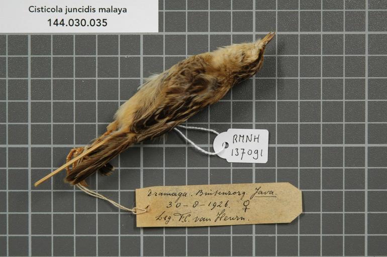 | Keywords: Naturalis Biodiversity Center - RMNH.AVES.137091 1 - Cisticola juncidis malaya Lynes, 1930 - Sylviidae - bird skin specimen.jpeg artwork Dimensions artwork Document type Sylviidae Cisticola Individual count 1 Infraspecific epithet malaya Infraspecific rank Institution Naturalis Kind of unit artwork Kind of unit specimen skin Life stage Indonesia Java Buitenzorg Dramaga Medium artwork Nomenclatural code Occurrence ID page Other fields Other versions artwork Permission license Naturalis donation CC-0 Publication location Scientific name Cisticola juncidis malaya Lynes 1930 Scientific name authorship Lynes 1930 female Source url http //bioportal naturalis nl Specific epithet juncidis State or province Subject keywords artwork Subject keywords publication Title artwork Title publication Type status Uploaded with GWToolset Naturalis_Biodiversity_Center_-_RMNH AVES 137091_1_-_Cisticola_juncidis_malaya_Lynes _1930_-_Sylviidae_-_bird_skin_specimen http //medialib naturalis nl/file/id/RMNH AVES 137091_1/format/large Media donated by Naturalis Biodiversity Center Songbird specimens at Naturalis Biodiversity Center Cisticola juncidis Cisticola |