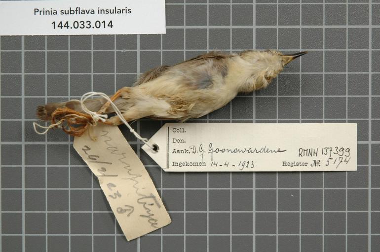 | Keywords: Naturalis Biodiversity Center - RMNH.AVES.137399 2 - Prinia subflava insularis (Legge, 1879) - Sylviidae - bird skin specimen.jpeg artwork Dimensions artwork Document type Sylviidae Prinia Individual count 1 Infraspecific epithet insularis Infraspecific rank Institution Naturalis Kind of unit artwork Kind of unit specimen skin Life stage Ceylon Narupitiya Medium artwork Nomenclatural code Occurrence ID page Other fields Other versions artwork Permission license Naturalis donation CC-0 Publication location Scientific name Prinia subflava insularis Legge 1879 Scientific name authorship Legge 1879 male Source url http //bioportal naturalis nl Specific epithet subflava State or province Subject keywords artwork Subject keywords publication Title artwork Title publication Type status Uploaded with GWToolset Naturalis_Biodiversity_Center_-_RMNH AVES 137399_2_-_Prinia_subflava_insularis_ Legge _1879 _-_Sylviidae_-_bird_skin_specimen http //medialib naturalis nl/file/id/RMNH AVES 137399_2/format/large Media donated by Naturalis Biodiversity Center Songbird specimens at Naturalis Biodiversity Center Prinia subflava Prinia |