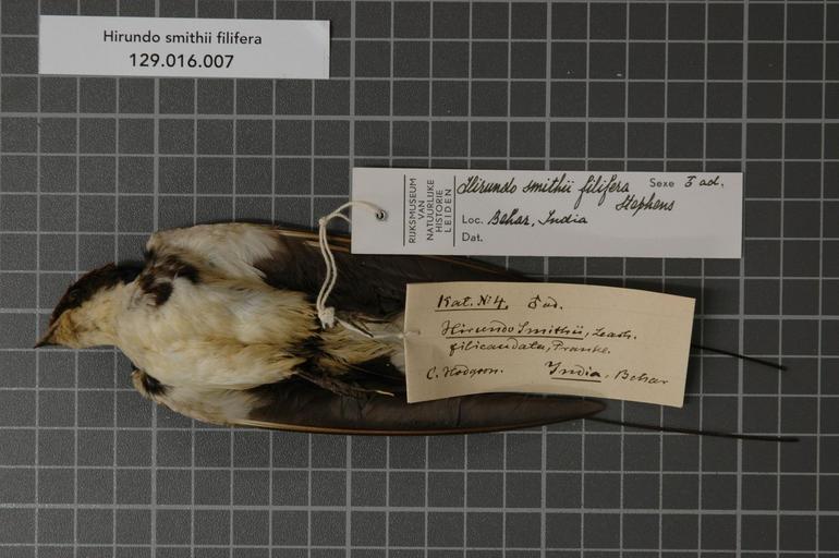 | Keywords: Naturalis Biodiversity Center - RMNH.AVES.125099 1 - Hirundo smithii filifera Stephens, 1825 - Hirundinidae - bird skin specimen.jpeg artwork Dimensions artwork Document type Hirundinidae Hirundo Individual count 1 Infraspecific epithet filifera Infraspecific rank Institution Naturalis Kind of unit artwork Kind of unit specimen skin Life stage adult India Behar Medium artwork Nomenclatural code Occurrence ID page Other fields Other versions artwork Permission license Naturalis donation CC-0 Publication location Scientific name Hirundo smithii filifera Stephens 1825 Scientific name authorship Stephens 1825 female Source url http //bioportal naturalis nl Specific epithet smithii State or province Subject keywords artwork Subject keywords publication Title artwork Title publication Type status Uploaded with GWToolset Naturalis_Biodiversity_Center_-_RMNH AVES 125099_1_-_Hirundo_smithii_filifera_Stephens _1825_-_Hirundinidae_-_bird_skin_specimen http //medialib naturalis nl/file/id/RMNH AVES 125099_1/format/large Media donated by Naturalis Biodiversity Center Songbird specimens at Naturalis Biodiversity Center Hirundo smithii museum specimens |