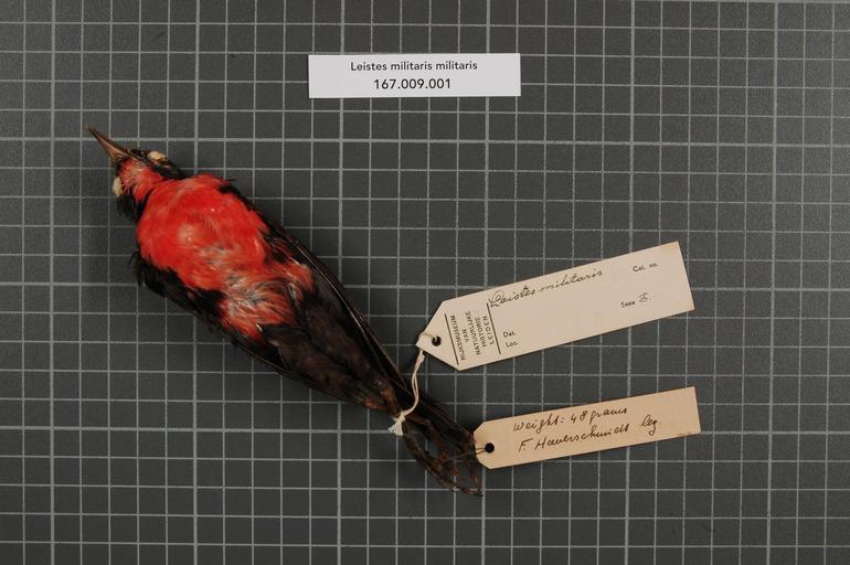 | Keywords: Naturalis Biodiversity Center - RMNH.AVES.14635 2 - Leistes militaris militaris (Linnaeus, 1758) - Icteridae - bird skin specimen.jpeg artwork Dimensions artwork Document type Icteridae Leistes Individual count 1 Infraspecific epithet militaris Infraspecific rank Institution Naturalis Kind of unit artwork Kind of unit specimen skin Life stage Surinam Zanderij Medium artwork Nomenclatural code Occurrence ID page Other fields Other versions artwork Permission license Naturalis donation CC-0 Publication location Scientific name Leistes militaris militaris Linnaeus 1758 Scientific name authorship Linnaeus 1758 male Source url http //bioportal naturalis nl Specific epithet militaris State or province Subject keywords artwork Subject keywords publication Title artwork Title publication Type status Uploaded with GWToolset Naturalis_Biodiversity_Center_-_RMNH AVES 14635_2_-_Leistes_militaris_militaris_ Linnaeus _1758 _-_Icteridae_-_bird_skin_specimen http //medialib naturalis nl/file/id/RMNH AVES 14635_2/format/large Media donated by Naturalis Biodiversity Center Songbird specimens at Naturalis Biodiversity Center Sturnella militaris |