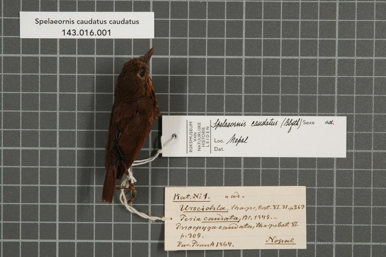 | Keywords: Naturalis Biodiversity Center - RMNH.AVES.147410 1 - Spelaeornis caudatus caudatus (Blyth, 1845) - Timaliidae - bird skin specimen.jpeg  artwork Dimensions artwork Document type Timaliidae Spelaeornis Individual count 1 Infraspecific epithet caudatus Infraspecific rank Institution Naturalis Kind of unit artwork Kind of unit specimen skin Life stage adult Nepal Medium artwork Nomenclatural code Age remark On Finsch- label ad Bodily condition only one leg Occurrence ID page Other fields Other versions artwork Permission license Naturalis donation CC-0 Publication location Scientific name Spelaeornis caudatus caudatus Blyth 1845 Scientific name authorship Blyth 1845 Source url http //bioportal naturalis nl Specific epithet caudatus State or province Subject keywords artwork Subject keywords publication Title artwork Title publication Type status Uploaded with GWToolset Naturalis_Biodiversity_Center_-_RMNH AVES 147410_1_-_Spelaeornis_caudatus_caudatus_ Blyth _1845 _-_Timaliidae_-_bird_skin_specimen http //medialib naturalis nl/file/id/RMNH AVES 147410_1/format/large Media donated by Naturalis Biodiversity Center Songbird specimens at Naturalis Biodiversity Center Spelaeornis Spelaeornis caudatus |