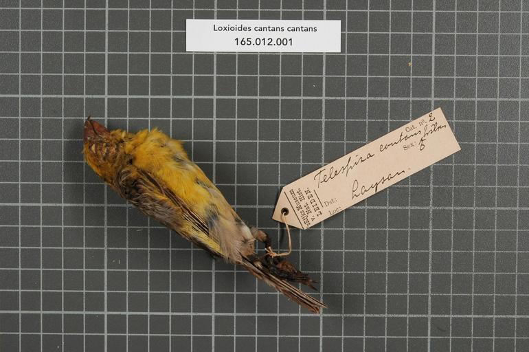 | Keywords: Naturalis Biodiversity Center - RMNH.AVES.148593 1 - Loxioides cantans cantans (Wilson, 1890) - Drepanididae - bird skin specimen.jpeg artwork Dimensions artwork Document type Drepanididae Loxioides Individual count 1 Infraspecific epithet cantans Infraspecific rank Institution Naturalis Kind of unit artwork Kind of unit specimen skin Life stage Laysan Medium artwork Nomenclatural code Occurrence ID page Other fields Other versions artwork Permission license Naturalis donation CC-0 Publication location Scientific name Loxioides cantans cantans Wilson 1890 Scientific name authorship Wilson 1890 male Source url http //bioportal naturalis nl Specific epithet cantans State or province Laysan Subject keywords artwork Subject keywords publication Title artwork Title publication Type status Uploaded with GWToolset Naturalis_Biodiversity_Center_-_RMNH AVES 148593_1_-_Loxioides_cantans_cantans_ Wilson _1890 _-_Drepanididae_-_bird_skin_specimen http //medialib naturalis nl/file/id/RMNH AVES 148593_1/format/large Media donated by Naturalis Biodiversity Center Songbird specimens at Naturalis Biodiversity Center Loxioides Loxioides cantans |