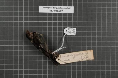 | Keywords: Naturalis Biodiversity Center - RMNH.AVES.149873 1 - Presrophila torqueola morelleti (Bonaparte, 1851) - Emberizidae - bird skin specimen.jpeg artwork Dimensions artwork Document type Emberizidae Sporophila Individual count 1 Infraspecific epithet morelleti Infraspecific rank Institution Naturalis Kind of unit artwork Kind of unit specimen skin Life stage Costa Rica St José Medium artwork Nomenclatural code Occurrence ID page Other fields Other versions artwork Permission license Naturalis donation CC-0 Publication location Scientific name Presrophila torqueola morelleti Bonaparte 1851 Scientific name authorship Bonaparte 1851 male Source url http //bioportal naturalis nl Specific epithet torqueola State or province Subject keywords artwork Subject keywords publication Title artwork Title publication Type status Uploaded with GWToolset Naturalis_Biodiversity_Center_-_RMNH AVES 149873_1_-_Presrophila_torqueola_morelleti_ Bonaparte _1851 _-_Emberizidae_-_bird_skin_specimen http //medialib naturalis nl/file/id/RMNH AVES 149873_1/format/large Media donated by Naturalis Biodiversity Center Songbird specimens at Naturalis Biodiversity Center Sporophila Sporophila torqueola |