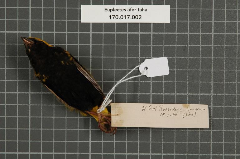 | Keywords: Naturalis Biodiversity Center - RMNH.AVES.151589 2 - Euplectes afer taha A. Smith, 1836 - Ploceidae - bird skin specimen.jpeg artwork Dimensions artwork Document type Ploceidae Euplectes Individual count 1 Infraspecific epithet taha Infraspecific rank Institution Naturalis Kind of unit artwork Kind of unit specimen skin Life stage Transvaal Ayres Medium artwork Nomenclatural code Occurrence ID page Other fields Other versions artwork Permission license Naturalis donation CC-0 Publication location Scientific name Euplectes afer taha A Smith 1836 Scientific name authorship A Smith 1836 Source url http //bioportal naturalis nl Specific epithet afer State or province Transvaal Subject keywords artwork Subject keywords publication Title artwork Title publication Type status Uploaded with GWToolset Naturalis_Biodiversity_Center_-_RMNH AVES 151589_2_-_Euplectes_afer_taha_A _Smith _1836_-_Ploceidae_-_bird_skin_specimen http //medialib naturalis nl/file/id/RMNH AVES 151589_2/format/large Media donated by Naturalis Biodiversity Center Songbird specimens at Naturalis Biodiversity Center Euplectes afer Euplectes |