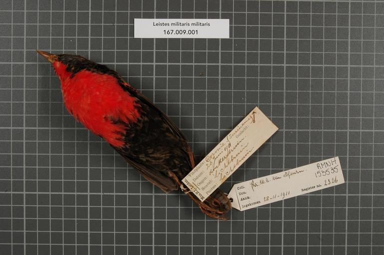Keywords: Naturalis Biodiversity Center - RMNH.AVES.153535 1 - Leistes militaris militaris (Linnaeus, 1758) - Icteridae - bird skin specimen.jpeg artwork Dimensions artwork Document type Icteridae Leistes Individual count 1 Infraspecific epithet militaris Infraspecific rank Institution Naturalis Kind of unit artwork Kind of unit specimen skin Life stage Suriname Coronie Medium artwork Nomenclatural code Occurrence ID page Other fields Other versions artwork Permission license Naturalis donation CC-0 Publication location Scientific name Leistes militaris militaris Linnaeus 1758 Scientific name authorship Linnaeus 1758 male Source url http //bioportal naturalis nl Specific epithet militaris State or province Coronie Subject keywords artwork Subject keywords publication Title artwork Title publication Type status Uploaded with GWToolset Naturalis_Biodiversity_Center_-_RMNH AVES 153535_1_-_Leistes_militaris_militaris_ Linnaeus _1758 _-_Icteridae_-_bird_skin_specimen http //medialib naturalis nl/file/id/RMNH AVES 153535_1/format/large Media donated by Naturalis Biodiversity Center Songbird specimens at Naturalis Biodiversity Center Sturnella militaris