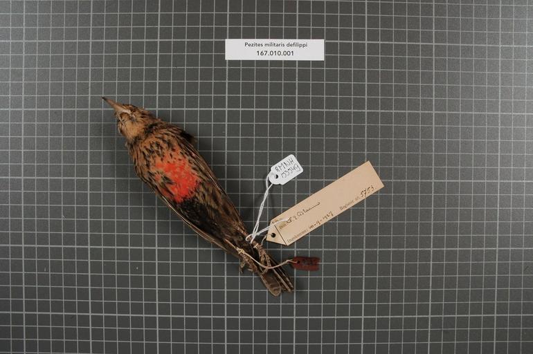 Keywords: Naturalis Biodiversity Center - RMNH.AVES.153549 2 - Pezites militaris defilippi (Bonaparte, 1851) - Icteridae - bird skin specimen.jpeg artwork Dimensions artwork Document type Icteridae Pezites Individual count 1 Infraspecific epithet defilippi Infraspecific rank Institution Naturalis Kind of unit artwork Kind of unit specimen skin Life stage Medium artwork Nomenclatural code Occurrence ID page Other fields Other versions artwork Permission license Naturalis donation CC-0 Publication location Scientific name Pezites militaris defilippi Bonaparte 1851 Scientific name authorship Bonaparte 1851 female Source url http //bioportal naturalis nl Specific epithet militaris State or province Subject keywords artwork Subject keywords publication Title artwork Title publication Type status Uploaded with GWToolset Naturalis_Biodiversity_Center_-_RMNH AVES 153549_2_-_Pezites_militaris_defilippi_ Bonaparte _1851 _-_Icteridae_-_bird_skin_specimen http //medialib naturalis nl/file/id/RMNH AVES 153549_2/format/large Media donated by Naturalis Biodiversity Center Songbird specimens at Naturalis Biodiversity Center Pezites militaris Pezites