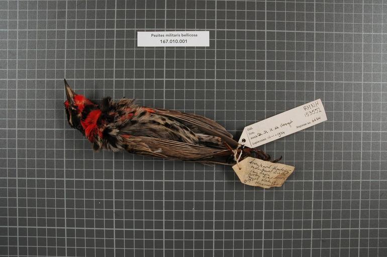 | Keywords: Naturalis Biodiversity Center - RMNH.AVES.153552 1 - Pezites militaris defilippi (Bonaparte, 1851) - Icteridae - bird skin specimen.jpeg artwork Dimensions artwork Document type Icteridae Pezites Individual count 1 Infraspecific epithet defilippi Infraspecific rank Institution Naturalis Kind of unit artwork Kind of unit specimen skin Life stage Peru Huanuco Medium artwork Nomenclatural code Occurrence ID page Other fields Other versions artwork Permission license Naturalis donation CC-0 Publication location Scientific name Pezites militaris defilippi Bonaparte 1851 Scientific name authorship Bonaparte 1851 male Source url http //bioportal naturalis nl Specific epithet militaris State or province Subject keywords artwork Subject keywords publication Title artwork Title publication Type status Uploaded with GWToolset Naturalis_Biodiversity_Center_-_RMNH AVES 153552_1_-_Pezites_militaris_defilippi_ Bonaparte _1851 _-_Icteridae_-_bird_skin_specimen http //medialib naturalis nl/file/id/RMNH AVES 153552_1/format/large Media donated by Naturalis Biodiversity Center Songbird specimens at Naturalis Biodiversity Center Pezites militaris Pezites |