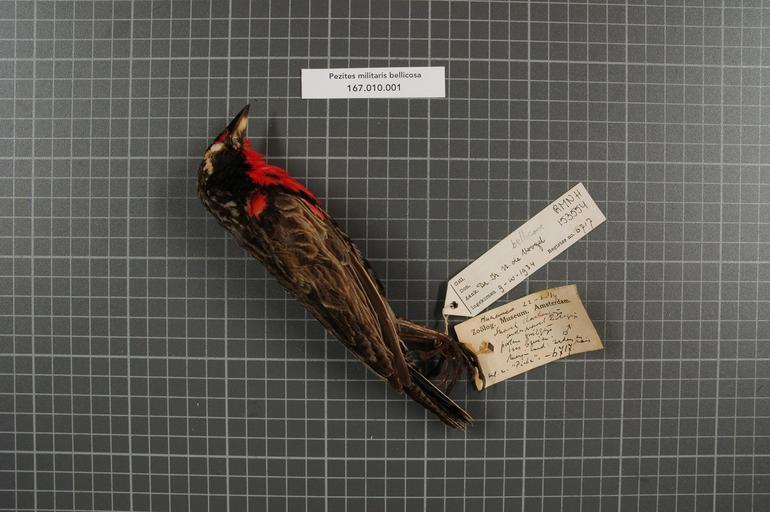 Keywords: Naturalis Biodiversity Center - RMNH.AVES.153554 1 - Pezites militaris bellicosa (Filippi, 1847) - Icteridae - bird skin specimen.jpeg artwork Dimensions artwork Document type Icteridae Pezites Individual count 1 Infraspecific epithet bellicosa Infraspecific rank Institution Naturalis Kind of unit artwork Kind of unit specimen skin Life stage Peru Huanuco Medium artwork Nomenclatural code Occurrence ID page Other fields Other versions artwork Permission license Naturalis donation CC-0 Publication location Scientific name Pezites militaris bellicosa Filippi 1847 Scientific name authorship Filippi 1847 male Source url http //bioportal naturalis nl Specific epithet militaris State or province Subject keywords artwork Subject keywords publication Title artwork Title publication Type status Uploaded with GWToolset Naturalis_Biodiversity_Center_-_RMNH AVES 153554_1_-_Pezites_militaris_bellicosa_ Filippi _1847 _-_Icteridae_-_bird_skin_specimen http //medialib naturalis nl/file/id/RMNH AVES 153554_1/format/large Media donated by Naturalis Biodiversity Center Songbird specimens at Naturalis Biodiversity Center Pezites militaris Pezites