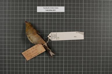 Keywords: Naturalis Biodiversity Center - RMNH.AVES.154027 2 - Carduelis tristis tristis (Linnaeus, 1758) - Fringillidae - bird skin specimen.jpeg artwork Dimensions artwork Document type Fringillidae Carduelis Individual count 1 Infraspecific epithet tristis Infraspecific rank Institution Naturalis Kind of unit artwork Kind of unit specimen skin Life stage adult N Y H Falls Medium artwork Nomenclatural code Occurrence ID page Other fields Other versions artwork Permission license Naturalis donation CC-0 Publication location Scientific name Carduelis tristis tristis Linnaeus 1758 Scientific name authorship Linnaeus 1758 male Source url http //bioportal naturalis nl Specific epithet tristis State or province N Y Subject keywords artwork Subject keywords publication Title artwork Title publication Type status Uploaded with GWToolset Naturalis_Biodiversity_Center_-_RMNH AVES 154027_2_-_Carduelis_tristis_tristis_ Linnaeus _1758 _-_Fringillidae_-_bird_skin_specimen http //medialib naturalis nl/file/id/RMNH AVES 154027_2/format/large Media donated by Naturalis Biodiversity Center Songbird specimens at Naturalis Biodiversity Center Spinus tristis Carduelis |