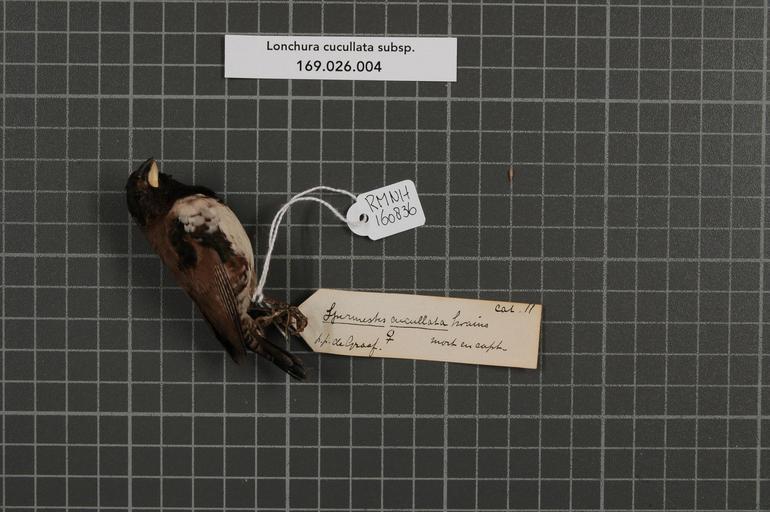 | Keywords: Naturalis Biodiversity Center - RMNH.AVES.160836 1 - Lonchura cucullata subsp. - Estrildidae - bird skin specimen.jpeg artwork Dimensions artwork Document type Estrildidae Lonchura Individual count 1 Infraspecific epithet subsp Infraspecific rank Institution Naturalis Kind of unit artwork Kind of unit specimen skin Life stage Medium artwork Nomenclatural code Occurrence ID page Other fields Other versions artwork Permission license Naturalis donation CC-0 Publication location Scientific name Lonchura cucullata subsp Scientific name authorship female Source url http //bioportal naturalis nl Specific epithet cucullata State or province Subject keywords artwork Subject keywords publication Title artwork Title publication Type status Uploaded with GWToolset Naturalis_Biodiversity_Center_-_RMNH AVES 160836_1_-_Lonchura_cucullata_subsp _-_Estrildidae_-_bird_skin_specimen http //medialib naturalis nl/file/id/RMNH AVES 160836_1/format/large Media donated by Naturalis Biodiversity Center Songbird specimens at Naturalis Biodiversity Center Lonchura cucullata Lonchura |