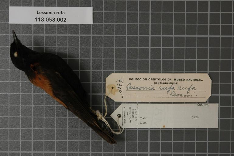 Keywords: Naturalis Biodiversity Center - RMNH.AVES.20381 1 - Lessonia rufa (Gmelin, 1789) - Tyrannidae - bird skin specimen.jpeg artwork Dimensions artwork Document type Tyrannidae Lessonia Individual count 1 Infraspecific epithet Infraspecific rank Institution Naturalis Kind of unit artwork Kind of unit specimen skin Life stage adult Tierra del Fuego Ekewern Medium artwork Nomenclatural code Occurrence ID page Other fields Other versions artwork Permission license Naturalis donation CC-0 Publication location Scientific name Lessonia rufa Gmelin 1789 Scientific name authorship Gmelin 1789 male Source url http //bioportal naturalis nl Specific epithet rufa State or province Tierra del Fuego Subject keywords artwork Subject keywords publication Title artwork Title publication Type status Uploaded with GWToolset Naturalis_Biodiversity_Center_-_RMNH AVES 20381_1_-_Lessonia_rufa_ Gmelin _1789 _-_Tyrannidae_-_bird_skin_specimen http //medialib naturalis nl/file/id/RMNH AVES 20381_1/format/large Media donated by Naturalis Biodiversity Center Songbird specimens at Naturalis Biodiversity Center Lessonia rufa Lessonia |