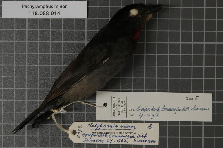 | Keywords: Naturalis Biodiversity Center - RMNH.AVES.33646 1 - Pachyramphus minor (Lesson, 1830) - Tyrannidae - bird skin specimen.jpeg artwork Dimensions artwork Document type Tyrannidae Pachyramphus Individual count 1 Infraspecific epithet Infraspecific rank Institution Naturalis Kind of unit artwork Kind of unit specimen skin Life stage Surinam Commenwijne Dist Moripocreek Medium artwork Nomenclatural code ADDITIONAL FAMILY INFO mated and nest building with 5094 Occurrence ID page Other fields Other versions artwork Permission license Naturalis donation CC-0 Publication location Scientific name Pachyramphus minor Lesson 1830 Scientific name authorship Lesson 1830 male Source url http //bioportal naturalis nl Specific epithet minor State or province Commenwijne Dist Subject keywords artwork Subject keywords publication Title artwork Title publication Type status Uploaded with GWToolset Naturalis_Biodiversity_Center_-_RMNH AVES 33646_1_-_Pachyramphus_minor_ Lesson _1830 _-_Tyrannidae_-_bird_skin_specimen http //medialib naturalis nl/file/id/RMNH AVES 33646_1/format/large Media donated by Naturalis Biodiversity Center Songbird specimens at Naturalis Biodiversity Center Pachyramphus minor Pachyramphus |