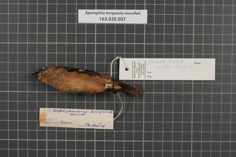 | Keywords: Naturalis Biodiversity Center - RMNH.AVES.34669 2 - Sporophila torqueola morelleti (Bonaparte, 1851) - Emberizidae - bird skin specimen.jpeg artwork Dimensions artwork Document type Emberizidae Sporophila Individual count 1 Infraspecific epithet morelleti Infraspecific rank Institution Naturalis Kind of unit artwork Kind of unit specimen skin Life stage Mexico Veracruz Fortin Medium artwork Nomenclatural code Bodily condition Fett II Sex remark on label male Occurrence ID page Other fields Other versions artwork Permission license Naturalis donation CC-0 Publication location Scientific name Sporophila torqueola morelleti Bonaparte 1851 Scientific name authorship Bonaparte 1851 male Source url http //bioportal naturalis nl Specific epithet torqueola State or province Veracruz Subject keywords artwork Subject keywords publication Title artwork Title publication Type status Uploaded with GWToolset Naturalis_Biodiversity_Center_-_RMNH AVES 34669_2_-_Sporophila_torqueola_morelleti_ Bonaparte _1851 _-_Emberizidae_-_bird_skin_specimen http //medialib naturalis nl/file/id/RMNH AVES 34669_2/format/large Media donated by Naturalis Biodiversity Center Songbird specimens at Naturalis Biodiversity Center Sporophila torqueola Sporophila |