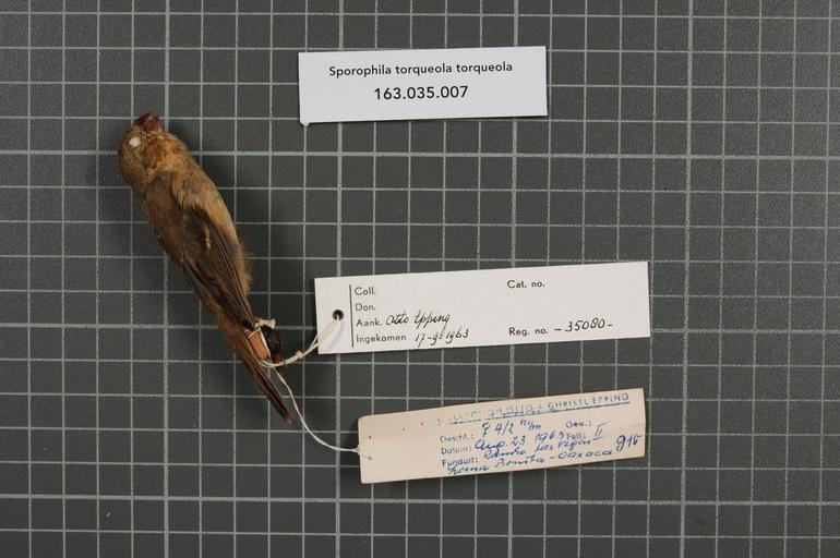 | Keywords: Naturalis Biodiversity Center - RMNH.AVES.35080 1 - Sporophila torqueola torqueola (Bonaparte, 1851) - Emberizidae - bird skin specimen.jpeg artwork Dimensions artwork Document type Emberizidae Sporophila Individual count 1 Infraspecific epithet torqueola Infraspecific rank Institution Naturalis Kind of unit artwork Kind of unit specimen skin Life stage Oaxaca Loma Bonita Rancho Las Vegas Medium artwork Nomenclatural code Bodily condition Fett II Occurrence ID page Other fields Other versions artwork Permission license Naturalis donation CC-0 Publication location Scientific name Sporophila torqueola torqueola Bonaparte 1851 Scientific name authorship Bonaparte 1851 female Source url http //bioportal naturalis nl Specific epithet torqueola State or province Oaxaca Subject keywords artwork Subject keywords publication Title artwork Title publication Type status Uploaded with GWToolset Naturalis_Biodiversity_Center_-_RMNH AVES 35080_1_-_Sporophila_torqueola_torqueola_ Bonaparte _1851 _-_Emberizidae_-_bird_skin_specimen http //medialib naturalis nl/file/id/RMNH AVES 35080_1/format/large Media donated by Naturalis Biodiversity Center Songbird specimens at Naturalis Biodiversity Center Sporophila torqueola Sporophila |