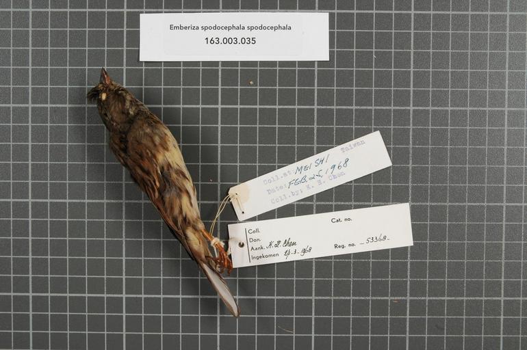| Keywords: Naturalis Biodiversity Center - RMNH.AVES.53368 1 - Emberiza spodocephala spodocephala Pallas, 1776 - Emberizidae - bird skin specimen.jpeg artwork Dimensions artwork Document type Emberizidae Emberiza Individual count 1 Infraspecific epithet spodocephala Infraspecific rank Institution Naturalis Kind of unit artwork Kind of unit specimen skin Life stage Taiwan Mei Chi Medium artwork Nomenclatural code Country remark On RMNH label Taiwan Formosa Sex remark On RMNH label female whipped out male GK Occurrence ID page Other fields Other versions artwork Permission license Naturalis donation CC-0 Publication location Scientific name Emberiza spodocephala spodocephala Pallas 1776 Scientific name authorship Pallas 1776 female Source url http //bioportal naturalis nl Specific epithet spodocephala State or province Subject keywords artwork Subject keywords publication Title artwork Title publication Type status Uploaded with GWToolset Naturalis_Biodiversity_Center_-_RMNH AVES 53368_1_-_Emberiza_spodocephala_spodocephala_Pallas _1776_-_Emberizidae_-_bird_skin_specimen http //medialib naturalis nl/file/id/RMNH AVES 53368_1/format/large Media donated by Naturalis Biodiversity Center Songbird specimens at Naturalis Biodiversity Center Emberiza spodocephala Emberiza |