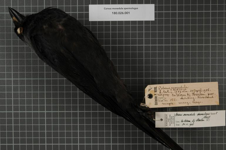 | Keywords: Naturalis Biodiversity Center - RMNH.AVES.56309 1 - Corvus monedula spermologus Vieillot, 1817 - Corvidae - bird skin specimen.jpeg artwork Dimensions artwork Document type Corvidae Corvus Individual count 1 Infraspecific epithet spermologus Infraspecific rank Institution Naturalis Kind of unit artwork Kind of unit specimen skin Life stage juvenile Netherlands Limburg Heerlen Ter Worm Medium artwork Nomenclatural code Bodily condition mAger Occurrence ID page Other fields Other versions artwork Permission license Naturalis donation CC-0 Publication location Scientific name Corvus monedula spermologus Vieillot 1817 Scientific name authorship Vieillot 1817 male Source url http //bioportal naturalis nl Specific epithet monedula State or province Limburg Subject keywords artwork Subject keywords publication Title artwork Title publication Type status Uploaded with GWToolset Naturalis_Biodiversity_Center_-_RMNH AVES 56309_1_-_Corvus_monedula_spermologus_Vieillot _1817_-_Corvidae_-_bird_skin_specimen http //medialib naturalis nl/file/id/RMNH AVES 56309_1/format/large Media donated by Naturalis Biodiversity Center Songbird specimens at Naturalis Biodiversity Center Coloeus monedula Corvus |
