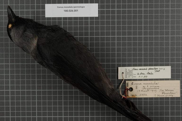 | Keywords: Naturalis Biodiversity Center - RMNH.AVES.56315 1 - Corvus monedula spermologus Vieillot, 1817 - Corvidae - bird skin specimen.jpeg artwork Dimensions artwork Document type Corvidae Corvus Individual count 1 Infraspecific epithet spermologus Infraspecific rank Institution Naturalis Kind of unit artwork Kind of unit specimen skin Life stage Netherlands Limburg Heerlen Ter Worm Medium artwork Nomenclatural code Bodily condition Was nog vet ADDITIONAL preparation info P Hens Occurrence ID page Other fields Other versions artwork Permission license Naturalis donation CC-0 Publication location Scientific name Corvus monedula spermologus Vieillot 1817 Scientific name authorship Vieillot 1817 female Source url http //bioportal naturalis nl Specific epithet monedula State or province Limburg Subject keywords artwork Subject keywords publication Title artwork Title publication Type status Uploaded with GWToolset Naturalis_Biodiversity_Center_-_RMNH AVES 56315_1_-_Corvus_monedula_spermologus_Vieillot _1817_-_Corvidae_-_bird_skin_specimen http //medialib naturalis nl/file/id/RMNH AVES 56315_1/format/large Media donated by Naturalis Biodiversity Center Songbird specimens at Naturalis Biodiversity Center Coloeus monedula Corvus |