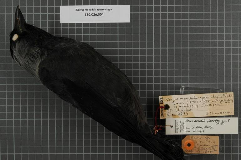 | Keywords: Naturalis Biodiversity Center - RMNH.AVES.56319 1 - Corvus monedula spermologus Vieillot, 1817 - Corvidae - bird skin specimen.jpeg artwork Dimensions artwork Document type Corvidae Corvus Individual count 1 Infraspecific epithet spermologus Infraspecific rank Institution Naturalis Kind of unit artwork Kind of unit specimen skin Life stage adult Netherlands Limburg Heerlen Ter Worm Medium artwork Nomenclatural code Bodily condition vet ADDITIONAL preparation info P Hens ADDITIONAL info remark on other label l 22x12 Occurrence ID page Other fields Other versions artwork Permission license Naturalis donation CC-0 Publication location Scientific name Corvus monedula spermologus Vieillot 1817 Scientific name authorship Vieillot 1817 male Source url http //bioportal naturalis nl Specific epithet monedula State or province Limburg Subject keywords artwork Subject keywords publication Title artwork Title publication Type status Uploaded with GWToolset Naturalis_Biodiversity_Center_-_RMNH AVES 56319_1_-_Corvus_monedula_spermologus_Vieillot _1817_-_Corvidae_-_bird_skin_specimen http //medialib naturalis nl/file/id/RMNH AVES 56319_1/format/large Media donated by Naturalis Biodiversity Center Songbird specimens at Naturalis Biodiversity Center Coloeus monedula Corvus |