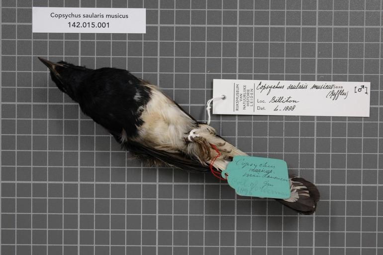 | Keywords: Naturalis Biodiversity Center - RMNH.AVES.129298 1 - Copsychus saularis musicus (Raffles, 1822) - Turdidae - bird skin specimen.jpeg artwork Dimensions artwork Document type Turdidae Copsychus Individual count 1 Infraspecific epithet musicus Infraspecific rank Institution Naturalis Kind of unit artwork Kind of unit specimen skin Life stage Medium artwork Nomenclatural code Sex remark On RMNH label male Occurrence ID page Other fields Other versions artwork Permission license Naturalis donation CC-0 Publication location Scientific name Copsychus saularis musicus Raffles 1822 Scientific name authorship Raffles 1822 male Source url http //bioportal naturalis nl Specific epithet saularis State or province Billiton Subject keywords artwork Subject keywords publication Title artwork Title publication Type status Uploaded with GWToolset Naturalis_Biodiversity_Center_-_RMNH AVES 129298_1_-_Copsychus_saularis_musicus_ Raffles _1822 _-_Turdidae_-_bird_skin_specimen http //medialib naturalis nl/file/id/RMNH AVES 129298_1/format/large Media donated by Naturalis Biodiversity Center Songbird specimens at Naturalis Biodiversity Center Copsychus saularis museum specimens |