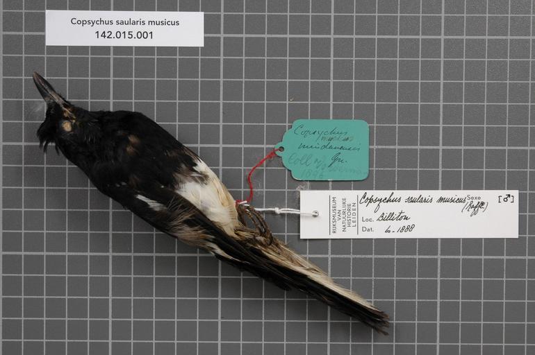| Keywords: Naturalis Biodiversity Center - RMNH.AVES.129299 1 - Copsychus saularis musicus (Raffles, 1822) - Turdidae - bird skin specimen.jpeg artwork Dimensions artwork Document type Turdidae Copsychus Individual count 1 Infraspecific epithet musicus Infraspecific rank Institution Naturalis Kind of unit artwork Kind of unit specimen skin Life stage Medium artwork Nomenclatural code Sex remark On RMNH label male Occurrence ID page Other fields Other versions artwork Permission license Naturalis donation CC-0 Publication location Scientific name Copsychus saularis musicus Raffles 1822 Scientific name authorship Raffles 1822 male Source url http //bioportal naturalis nl Specific epithet saularis State or province Billiton Subject keywords artwork Subject keywords publication Title artwork Title publication Type status Uploaded with GWToolset Naturalis_Biodiversity_Center_-_RMNH AVES 129299_1_-_Copsychus_saularis_musicus_ Raffles _1822 _-_Turdidae_-_bird_skin_specimen http //medialib naturalis nl/file/id/RMNH AVES 129299_1/format/large Media donated by Naturalis Biodiversity Center Songbird specimens at Naturalis Biodiversity Center Copsychus saularis museum specimens |