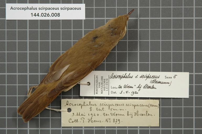 | Keywords: Naturalis Biodiversity Center - RMNH.AVES.58164 1 - Acrocephalus scirpaceus scirpaceus (Hermann, 1804) - Sylviidae - bird skin specimen.jpeg artwork Dimensions artwork Document type Sylviidae Acrocephalus Individual count 1 Infraspecific epithet scirpaceus Infraspecific rank Institution Naturalis Kind of unit artwork Kind of unit specimen skin Life stage ter Worm bij Heerlen Medium artwork Nomenclatural code Occurrence ID page Other fields Other versions artwork Permission license Naturalis donation CC-0 Publication location Scientific name Acrocephalus scirpaceus scirpaceus Hermann 1804 Scientific name authorship Hermann 1804 male Source url http //bioportal naturalis nl Specific epithet scirpaceus State or province Subject keywords artwork Subject keywords publication Title artwork Title publication Type status Uploaded with GWToolset Naturalis_Biodiversity_Center_-_RMNH AVES 58164_1_-_Acrocephalus_scirpaceus_scirpaceus_ Hermann _1804 _-_Sylviidae_-_bird_skin_specimen http //medialib naturalis nl/file/id/RMNH AVES 58164_1/format/large Media donated by Naturalis Biodiversity Center Songbird specimens at Naturalis Biodiversity Center Acrocephalus scirpaceus Acrocephalus |