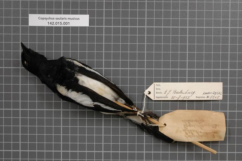 | Keywords: Naturalis Biodiversity Center - RMNH.AVES.129332 2 - Copsychus saularis musicus (Raffles, 1822) - Turdidae - bird skin specimen.jpeg artwork Dimensions artwork Document type Turdidae Copsychus Individual count 1 Infraspecific epithet musicus Infraspecific rank Institution Naturalis Kind of unit artwork Kind of unit specimen skin Life stage Medium artwork Nomenclatural code Occurrence ID page Other fields Other versions artwork Permission license Naturalis donation CC-0 Publication location Scientific name Copsychus saularis musicus Raffles 1822 Scientific name authorship Raffles 1822 male Source url http //bioportal naturalis nl Specific epithet saularis State or province Sumatra Res Palembang Subject keywords artwork Subject keywords publication Title artwork Title publication Type status Uploaded with GWToolset Naturalis_Biodiversity_Center_-_RMNH AVES 129332_2_-_Copsychus_saularis_musicus_ Raffles _1822 _-_Turdidae_-_bird_skin_specimen http //medialib naturalis nl/file/id/RMNH AVES 129332_2/format/large Media donated by Naturalis Biodiversity Center Songbird specimens at Naturalis Biodiversity Center Copsychus saularis museum specimens |