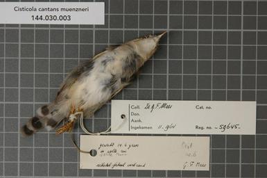| Keywords: Naturalis Biodiversity Center - RMNH.AVES.59645 2 - Cisticola cantans muenzneri Reichenow, 1916 - Sylviidae - bird skin specimen.jpeg artwork Dimensions artwork Document type Sylviidae Cisticola Individual count 1 Infraspecific epithet muenzneri Infraspecific rank Institution Naturalis Kind of unit artwork Kind of unit specimen skin Life stage Rhodesia Inyanga Nat Park Medium artwork Nomenclatural code Occurrence ID page Other fields Other versions artwork Permission license Naturalis donation CC-0 Publication location Scientific name Cisticola cantans muenzneri Reichenow 1916 Scientific name authorship Reichenow 1916 male Source url http //bioportal naturalis nl Specific epithet cantans State or province Inyanga Nat Park Subject keywords artwork Subject keywords publication Title artwork Title publication Type status Uploaded with GWToolset Naturalis_Biodiversity_Center_-_RMNH AVES 59645_2_-_Cisticola_cantans_muenzneri_Reichenow _1916_-_Sylviidae_-_bird_skin_specimen http //medialib naturalis nl/file/id/RMNH AVES 59645_2/format/large Media donated by Naturalis Biodiversity Center Songbird specimens at Naturalis Biodiversity Center Cisticola cantans Cisticola |