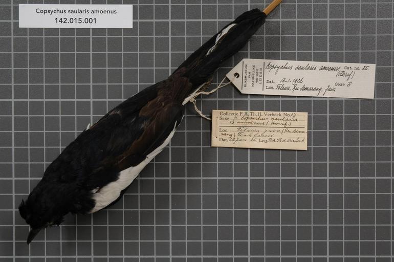 | Keywords: Naturalis Biodiversity Center - RMNH.AVES.129424 1 - Copsychus saularis amoenus (Horsfield, 1821) - Turdidae - bird skin specimen.jpeg  artwork Dimensions artwork Document type Turdidae Copsychus Individual count 1 Infraspecific epithet amoenus Infraspecific rank Institution Naturalis Kind of unit artwork Kind of unit specimen skin Life stage Medium artwork Nomenclatural code Occurrence ID page Other fields Other versions artwork Permission license Naturalis donation CC-0 Publication location Scientific name Copsychus saularis amoenus Horsfield 1821 Scientific name authorship Horsfield 1821 male Source url http //bioportal naturalis nl Specific epithet saularis State or province Java Res Semarang Subject keywords artwork Subject keywords publication Title artwork Title publication Type status Uploaded with GWToolset Naturalis_Biodiversity_Center_-_RMNH AVES 129424_1_-_Copsychus_saularis_amoenus_ Horsfield _1821 _-_Turdidae_-_bird_skin_specimen http //medialib naturalis nl/file/id/RMNH AVES 129424_1/format/large Media donated by Naturalis Biodiversity Center Songbird specimens at Naturalis Biodiversity Center Copsychus saularis museum specimens  |