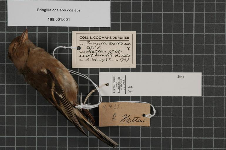 Keywords: Naturalis Biodiversity Center - RMNH.AVES.60698 1 - Fringilla coelebs coelebs Linnaeus, 1758 - Fringillidae - bird skin specimen.jpeg artwork Dimensions artwork Document type Fringillidae Fringilla Individual count 1 Infraspecific epithet coelebs Infraspecific rank Institution Naturalis Kind of unit artwork Kind of unit specimen skin Life stage Netherlands Gelderland Hattem Medium artwork Nomenclatural code Region remark On Coomans label Gld Occurrence ID page Other fields Other versions artwork Permission license Naturalis donation CC-0 Publication location Scientific name Fringilla coelebs coelebs Linnaeus 1758 Scientific name authorship Linnaeus 1758 female Source url http //bioportal naturalis nl Specific epithet coelebs State or province Gelderland Subject keywords artwork Subject keywords publication Title artwork Title publication Type status Uploaded with GWToolset Naturalis_Biodiversity_Center_-_RMNH AVES 60698_1_-_Fringilla_coelebs_coelebs_Linnaeus _1758_-_Fringillidae_-_bird_skin_specimen http //medialib naturalis nl/file/id/RMNH AVES 60698_1/format/large Media donated by Naturalis Biodiversity Center Songbird specimens at Naturalis Biodiversity Center Fringilla coelebs Fringilla |