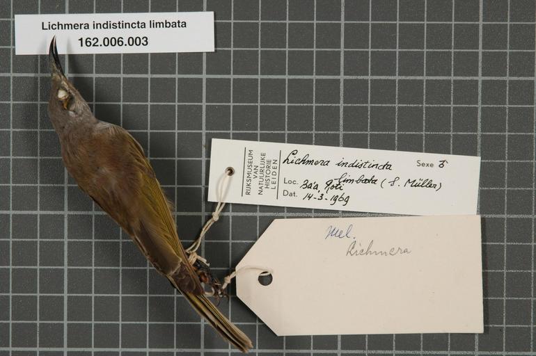 | Keywords: Naturalis Biodiversity Center - RMNH.AVES.65542 1 - Lichmera indistincta limbata (S. Muller, 1843) - Meliphagidae - bird skin specimen.jpeg artwork Dimensions artwork Document type Meliphagidae Lichmera Individual count 1 Infraspecific epithet limbata Infraspecific rank Institution Naturalis Kind of unit artwork Kind of unit specimen skin Life stage Roti Ba'a Medium artwork Nomenclatural code Occurrence ID page Other fields Other versions artwork Permission license Naturalis donation CC-0 Publication location Scientific name Lichmera indistincta limbata S Muller 1843 Scientific name authorship S Müller 1843 male Source url http //bioportal naturalis nl Specific epithet indistincta State or province Roti Subject keywords artwork Subject keywords publication Title artwork Title publication Type status Uploaded with GWToolset Naturalis_Biodiversity_Center_-_RMNH AVES 65542_1_-_Lichmera_indistincta_limbata_ S _Muller _1843 _-_Meliphagidae_-_bird_skin_specimen http //medialib naturalis nl/file/id/RMNH AVES 65542_1/format/large Media donated by Naturalis Biodiversity Center Songbird specimens at Naturalis Biodiversity Center Lichmera indistincta Lichmera |