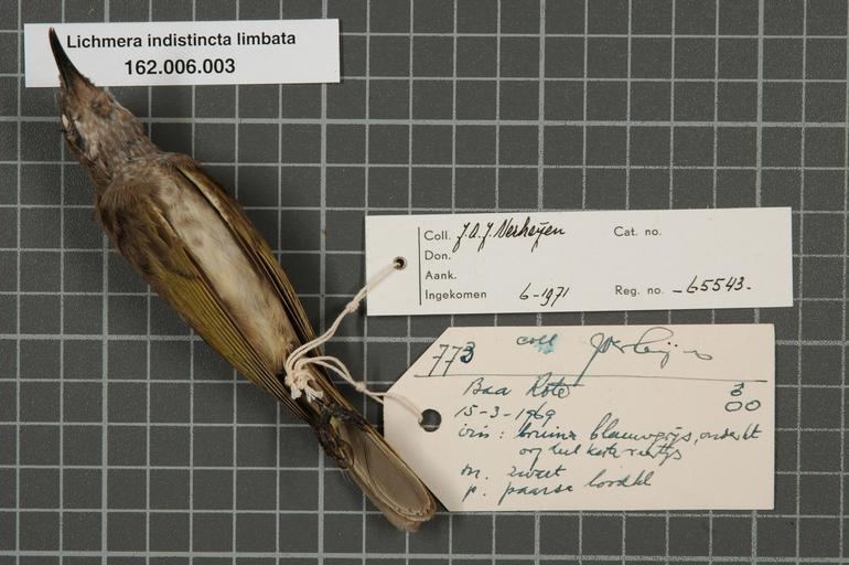 | Keywords: Naturalis Biodiversity Center - RMNH.AVES.65543 2 - Lichmera indistincta limbata (S. Muller, 1843) - Meliphagidae - bird skin specimen.jpeg artwork Dimensions artwork Document type Meliphagidae Lichmera Individual count 1 Infraspecific epithet limbata Infraspecific rank Institution Naturalis Kind of unit artwork Kind of unit specimen skin Life stage Roti Ba'a Medium artwork Nomenclatural code Occurrence ID page Other fields Other versions artwork Permission license Naturalis donation CC-0 Publication location Scientific name Lichmera indistincta limbata S Muller 1843 Scientific name authorship S Müller 1843 male Source url http //bioportal naturalis nl Specific epithet indistincta State or province Roti Subject keywords artwork Subject keywords publication Title artwork Title publication Type status Uploaded with GWToolset Naturalis_Biodiversity_Center_-_RMNH AVES 65543_2_-_Lichmera_indistincta_limbata_ S _Muller _1843 _-_Meliphagidae_-_bird_skin_specimen http //medialib naturalis nl/file/id/RMNH AVES 65543_2/format/large Media donated by Naturalis Biodiversity Center Songbird specimens at Naturalis Biodiversity Center Lichmera indistincta Lichmera |