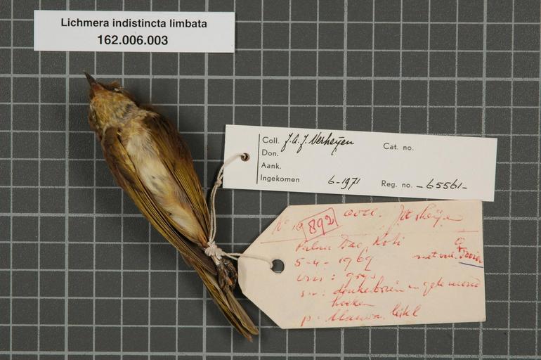 | Keywords: Naturalis Biodiversity Center - RMNH.AVES.65561 2 - Lichmera indistincta limbata (S. Muller, 1843) - Meliphagidae - bird skin specimen.jpeg artwork Dimensions artwork Document type Meliphagidae Lichmera Individual count 1 Infraspecific epithet limbata Infraspecific rank Institution Naturalis Kind of unit artwork Kind of unit specimen skin Life stage Roti Palau Dao Medium artwork Nomenclatural code Occurrence ID page Other fields Other versions artwork Permission license Naturalis donation CC-0 Publication location Scientific name Lichmera indistincta limbata S Muller 1843 Scientific name authorship S Müller 1843 female Source url http //bioportal naturalis nl Specific epithet indistincta State or province Roti Subject keywords artwork Subject keywords publication Title artwork Title publication Type status Uploaded with GWToolset Naturalis_Biodiversity_Center_-_RMNH AVES 65561_2_-_Lichmera_indistincta_limbata_ S _Muller _1843 _-_Meliphagidae_-_bird_skin_specimen http //medialib naturalis nl/file/id/RMNH AVES 65561_2/format/large Media donated by Naturalis Biodiversity Center Songbird specimens at Naturalis Biodiversity Center Lichmera indistincta Lichmera |