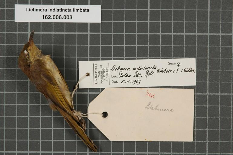 | Keywords: Naturalis Biodiversity Center - RMNH.AVES.65561 1 - Lichmera indistincta limbata (S. Muller, 1843) - Meliphagidae - bird skin specimen.jpeg artwork Dimensions artwork Document type Meliphagidae Lichmera Individual count 1 Infraspecific epithet limbata Infraspecific rank Institution Naturalis Kind of unit artwork Kind of unit specimen skin Life stage Roti Palau Dao Medium artwork Nomenclatural code Occurrence ID page Other fields Other versions artwork Permission license Naturalis donation CC-0 Publication location Scientific name Lichmera indistincta limbata S Muller 1843 Scientific name authorship S Müller 1843 female Source url http //bioportal naturalis nl Specific epithet indistincta State or province Roti Subject keywords artwork Subject keywords publication Title artwork Title publication Type status Uploaded with GWToolset Naturalis_Biodiversity_Center_-_RMNH AVES 65561_1_-_Lichmera_indistincta_limbata_ S _Muller _1843 _-_Meliphagidae_-_bird_skin_specimen http //medialib naturalis nl/file/id/RMNH AVES 65561_1/format/large Media donated by Naturalis Biodiversity Center Songbird specimens at Naturalis Biodiversity Center Lichmera indistincta Lichmera |