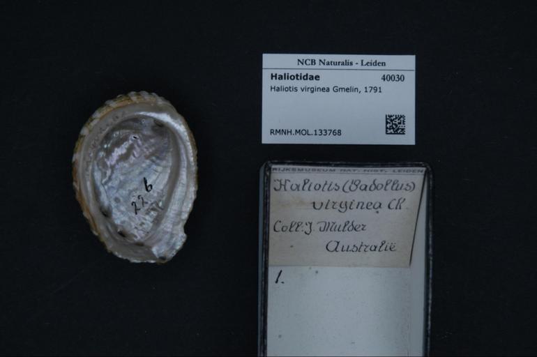| Keywords: Naturalis Biodiversity Center - RMNH.MOL.133768 - Haliotis virginea Gmelin, 1791 - Haliotidae - Mollusc shell.jpeg artwork Dimensions artwork Document type Haliotidae Haliotis Individual count Infraspecific epithet Infraspecific rank Institution Naturalis Kind of unit artwork Kind of unit specimen shell Life stage Medium artwork Nomenclatural code Source institute Leiden Scale the width of the text on the species/QR-code label is 38 mm Occurrence ID page Other fields Other versions artwork Permission license Naturalis donation CC-0 Mollusca Publication location Scientific name Haliotis virginea Gmelin 1791 Scientific name authorship Gmelin 1791 Source url http //bioportal naturalis nl Specific epithet virginea State or province Subject keywords artwork Subject keywords publication Title artwork Title publication Type status Uploaded with GWToolset Naturalis_Biodiversity_Center_-_RMNH MOL 133768_-_Haliotis_virginea_Gmelin _1791_-_Haliotidae_-_Mollusc_shell http //medialib naturalis nl/file/id/RMNH MOL 133768/format/large Molluscs at Naturalis from the Rijksmuseum van Natuurlijke Historie Media donated by Naturalis Biodiversity Center Haliotis Haliotis virginea |