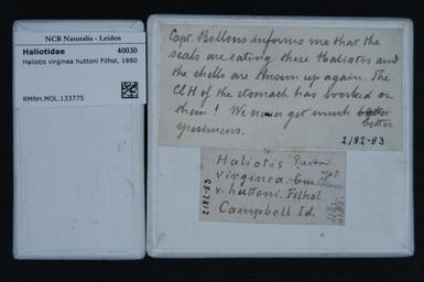 | Keywords: Naturalis Biodiversity Center - RMNH.MOL.133775 1 - Haliotis virginea huttoni Filhol, 1880 - Haliotidae - Mollusc shell.jpeg artwork Dimensions artwork Document type Haliotidae Haliotis Individual count Infraspecific epithet Infraspecific rank Institution Naturalis Kind of unit artwork Kind of unit specimen shell Life stage Medium artwork Nomenclatural code Source institute Leiden Scale the width of the text on the species/QR-code label is 38 mm Occurrence ID page Other fields Other versions artwork Permission license Naturalis donation CC-0 Mollusca Publication location Scientific name Haliotis virginea huttoni Filhol 1880 Scientific name authorship Filhol 1880 Source url http //bioportal naturalis nl Specific epithet virginea huttoni State or province Subject keywords artwork Subject keywords publication Title artwork Title publication Type status Uploaded with GWToolset Naturalis_Biodiversity_Center_-_RMNH MOL 133775_1_-_Haliotis_virginea_huttoni_Filhol _1880_-_Haliotidae_-_Mollusc_shell http //medialib naturalis nl/file/id/RMNH MOL 133775_1/format/large Molluscs at Naturalis from the Rijksmuseum van Natuurlijke Historie Media donated by Naturalis Biodiversity Center Haliotis Haliotis virginea huttoni |