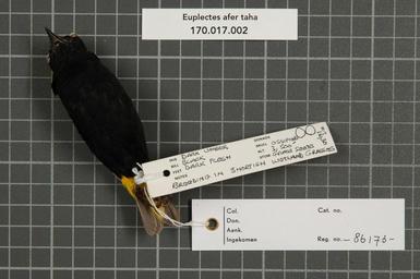 | Keywords: Naturalis Biodiversity Center - RMNH.AVES.86173 2 - Euplectes afer taha A. Smith, 1836 - Ploceidae - bird skin specimen.jpeg artwork Dimensions artwork Document type Ploceidae Euplectes Individual count 1 Infraspecific epithet taha Infraspecific rank Institution Naturalis Kind of unit artwork Kind of unit specimen skin Life stage adult South Africa Natal Klip River Ladysmith Medium artwork Nomenclatural code Occurrence ID page Other fields Other versions artwork Permission license Naturalis donation CC-0 Publication location Scientific name Euplectes afer taha A Smith 1836 Scientific name authorship A Smith 1836 male Source url http //bioportal naturalis nl Specific epithet afer State or province Natal Subject keywords artwork Subject keywords publication Title artwork Title publication Type status Uploaded with GWToolset Naturalis_Biodiversity_Center_-_RMNH AVES 86173_2_-_Euplectes_afer_taha_A _Smith _1836_-_Ploceidae_-_bird_skin_specimen http //medialib naturalis nl/file/id/RMNH AVES 86173_2/format/large Media donated by Naturalis Biodiversity Center Songbird specimens at Naturalis Biodiversity Center Euplectes afer |