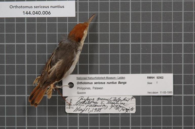 | Keywords: Naturalis Biodiversity Center - RMNH.AVES.92902 1 - Orthotomus sericeus nuntius Bangs, 1922 - Sylviidae - bird skin specimen.jpeg artwork Dimensions artwork Document type Sylviidae Orthotomus Individual count 1 Infraspecific epithet nuntius Infraspecific rank Institution Naturalis Kind of unit artwork Kind of unit specimen skin Life stage Philippines Palawan Quezon Medium artwork Nomenclatural code Occurrence ID page Other fields Other versions artwork Permission license Naturalis donation CC-0 Publication location Scientific name Orthotomus sericeus nuntius Bangs 1922 Scientific name authorship Bangs 1922 female Source url http //bioportal naturalis nl Specific epithet sericeus State or province Palawan Subject keywords artwork Subject keywords publication Title artwork Title publication Type status Uploaded with GWToolset Naturalis_Biodiversity_Center_-_RMNH AVES 92902_1_-_Orthotomus_sericeus_nuntius_Bangs _1922_-_Sylviidae_-_bird_skin_specimen http //medialib naturalis nl/file/id/RMNH AVES 92902_1/format/large Media donated by Naturalis Biodiversity Center Songbird specimens at Naturalis Biodiversity Center Orthotomus sericeus |