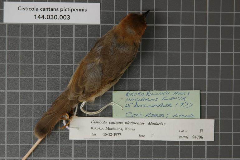 | Keywords: Naturalis Biodiversity Center - RMNH.AVES.94706 1 - Cisticola cantans pictipennis Madarász, 1904 - Sylviidae - bird skin specimen.jpeg artwork Dimensions artwork Document type Sylviidae Cisticola Individual count 1 Infraspecific epithet pictipennis Infraspecific rank Institution Naturalis Kind of unit artwork Kind of unit specimen skin Life stage Kenya Machakos Kilungu Hills Kikoko Medium artwork Nomenclatural code Occurrence ID page Other fields Other versions artwork Permission license Naturalis donation CC-0 Publication location Scientific name Cisticola cantans pictipennis Madarász 1904 Scientific name authorship Madarász 1904 female Source url http //bioportal naturalis nl Specific epithet cantans State or province Machakos Kilungu Hills Subject keywords artwork Subject keywords publication Title artwork Title publication Type status Uploaded with GWToolset Naturalis_Biodiversity_Center_-_RMNH AVES 94706_1_-_Cisticola_cantans_pictipennis_Madarász _1904_-_Sylviidae_-_bird_skin_specimen http //medialib naturalis nl/file/id/RMNH AVES 94706_1/format/large Media donated by Naturalis Biodiversity Center Songbird specimens at Naturalis Biodiversity Center Cisticola cantans museum specimens |