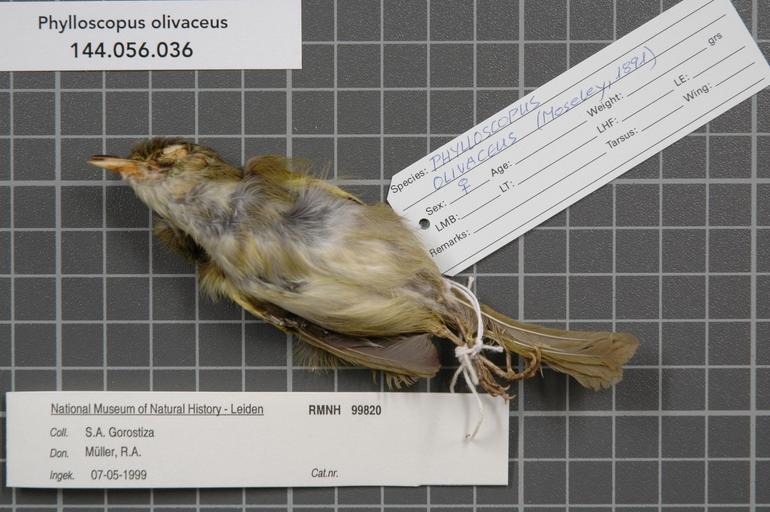 | Keywords: Naturalis Biodiversity Center - RMNH.AVES.99820 2 - Phylloscopus olivaceus (Moseley, 1891) - Sylviidae - bird skin specimen.jpeg artwork Dimensions artwork Document type Sylviidae Phylloscopus Individual count 1 Infraspecific epithet Infraspecific rank Institution Naturalis Kind of unit artwork Kind of unit specimen skin Life stage Philippines Mindanao Isl Lanao del Sur Saronaian Lumba-Bayabao Mt Piagayungan Medium artwork Nomenclatural code Occurrence ID page Other fields Other versions artwork Permission license Naturalis donation CC-0 Publication location Scientific name Phylloscopus olivaceus Moseley 1891 Scientific name authorship Moseley 1891 female Source url http //bioportal naturalis nl Specific epithet olivaceus State or province Subject keywords artwork Subject keywords publication Title artwork Title publication Type status Uploaded with GWToolset Naturalis_Biodiversity_Center_-_RMNH AVES 99820_2_-_Phylloscopus_olivaceus_ Moseley _1891 _-_Sylviidae_-_bird_skin_specimen http //medialib naturalis nl/file/id/RMNH AVES 99820_2/format/large Media donated by Naturalis Biodiversity Center Songbird specimens at Naturalis Biodiversity Center Phylloscopus olivaceus museum specimens |