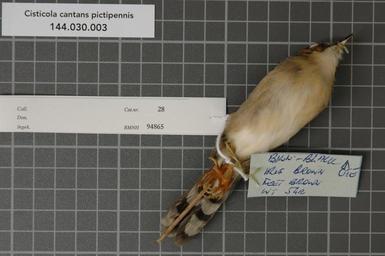| Keywords: Naturalis Biodiversity Center - RMNH.AVES.94865 2 - Cisticola cantans pictipennis Madarász, 1904 - Sylviidae - bird skin specimen.jpeg artwork Dimensions artwork Document type Sylviidae Cisticola Individual count 1 Infraspecific epithet pictipennis Infraspecific rank Institution Naturalis Kind of unit artwork Kind of unit specimen skin Life stage Kenya Machakos distr Muumandu Hill Medium artwork Nomenclatural code Occurrence ID page Other fields Other versions artwork Permission license Naturalis donation CC-0 Publication location Scientific name Cisticola cantans pictipennis Madarász 1904 Scientific name authorship Madarász 1904 male Source url http //bioportal naturalis nl Specific epithet cantans State or province Machakos distr Subject keywords artwork Subject keywords publication Title artwork Title publication Type status Uploaded with GWToolset Naturalis_Biodiversity_Center_-_RMNH AVES 94865_2_-_Cisticola_cantans_pictipennis_Madarász _1904_-_Sylviidae_-_bird_skin_specimen http //medialib naturalis nl/file/id/RMNH AVES 94865_2/format/large Media donated by Naturalis Biodiversity Center Songbird specimens at Naturalis Biodiversity Center Cisticola cantans museum specimens |