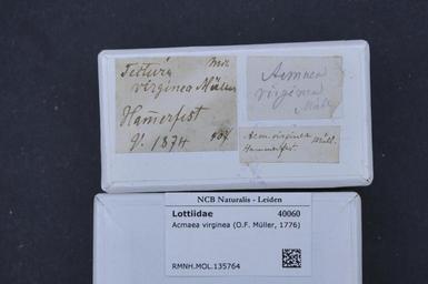 | Keywords: Naturalis Biodiversity Center - RMNH.MOL.135764 1 - Tectura virginea (Müller, 1776) - Lottiidae - Mollusc shell.jpeg artwork Dimensions artwork Document type Lottiidae Tectura Individual count Infraspecific epithet Infraspecific rank Institution Naturalis Kind of unit artwork Kind of unit specimen shell Life stage Medium artwork Nomenclatural code Source institute Leiden Scale the width of the text on the species/QR-code label is 38 mm Occurrence ID page Other fields Other versions artwork Permission license Naturalis donation CC-0 Mollusca Publication location Scientific name Tectura virginea Müller 1776 Scientific name authorship Müller 1776 Source url http //bioportal naturalis nl Specific epithet virginea State or province Subject keywords artwork Subject keywords publication Title artwork Title publication Type status Uploaded with GWToolset Naturalis_Biodiversity_Center_-_RMNH MOL 135764_1_-_Tectura_virginea_ Müller _1776 _-_Lottiidae_-_Mollusc_shell http //medialib naturalis nl/file/id/RMNH MOL 135764_1/format/large Molluscs at Naturalis from the Rijksmuseum van Natuurlijke Historie Media donated by Naturalis Biodiversity Center Tectura virginea |