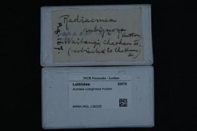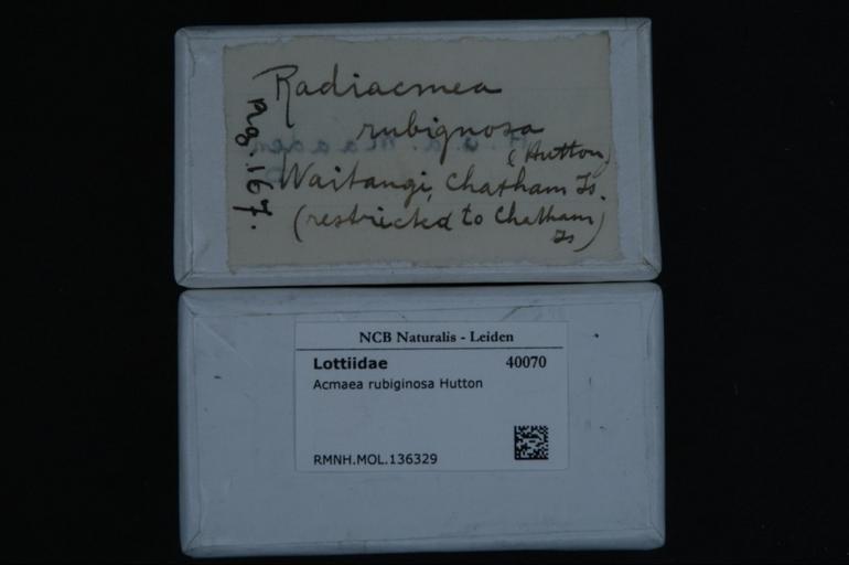Keywords: Naturalis Biodiversity Center - RMNH.MOL.136329 1 - Acmaea rubiginosa Hutton - Lottiidae - Mollusc shell.jpeg artwork Dimensions artwork Document type Lottiidae Acmaea Individual count Infraspecific epithet Infraspecific rank Institution Naturalis Kind of unit artwork Kind of unit specimen shell Life stage Medium artwork Nomenclatural code Source institute Leiden Scale the width of the text on the species/QR-code label is 38 mm Occurrence ID page Other fields Other versions artwork Permission license Naturalis donation CC-0 Mollusca Publication location Scientific name Acmaea rubiginosa Hutton Scientific name authorship Hutton Source url http //bioportal naturalis nl Specific epithet rubiginosa State or province Subject keywords artwork Subject keywords publication Title artwork Title publication Type status Uploaded with GWToolset Naturalis_Biodiversity_Center_-_RMNH MOL 136329_1_-_Acmaea_rubiginosa_Hutton_-_Lottiidae_-_Mollusc_shell http //medialib naturalis nl/file/id/RMNH MOL 136329_1/format/large Molluscs at Naturalis from the Rijksmuseum van Natuurlijke Historie Media donated by Naturalis Biodiversity Center Acmaea rubiginosa
