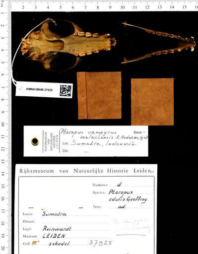 | Keywords: Naturalis Biodiversity Center - RMNH.MAM.37925-pal - Pteropus vampyrus - Bat - Loose bones.jpg en Pteropus vampyrus Preserved specimen loose bones skull adult Sumatra Indonesia Collector Reinwardt C G C Cat Jent 1887 p 258 Pt edulis date page Institution Naturalis other versions Custom license marker 2015 08 13 Naturalis donation CC0 Uploaded with UploadWizard Media donated by Naturalis Biodiversity Center Pteropus vampyrus Mammals at Naturalis from the Rijksmuseum van Natuurlijke Historie |