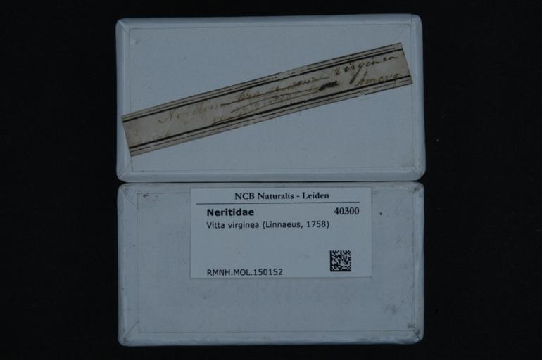 | Keywords: Naturalis Biodiversity Center - RMNH.MOL.150152 1 - Vitta virginea (Linnaeus, 1758) - Neritidae - Mollusc shell.jpeg artwork Dimensions artwork Document type Neritidae Vitta Individual count Infraspecific epithet Infraspecific rank Institution Naturalis Kind of unit artwork Kind of unit specimen shell Life stage Medium artwork Nomenclatural code Scale the width of the text on the species/QR-code label is 38 mm Occurrence ID page Other fields Other versions artwork Permission license Naturalis donation CC-0 Mollusca Publication location Scientific name Vitta virginea Linnaeus 1758 Scientific name authorship Linnaeus 1758 Source url http //bioportal naturalis nl Specific epithet virginea State or province Subject keywords artwork Subject keywords publication Title artwork Title publication Type status Uploaded with GWToolset Naturalis_Biodiversity_Center_-_RMNH MOL 150152_1_-_Vitta_virginea_ Linnaeus _1758 _-_Neritidae_-_Mollusc_shell http //medialib naturalis nl/file/id/RMNH MOL 150152_1/format/large Media donated by Naturalis Biodiversity Center Molluscs at Naturalis from the Rijksmuseum van Natuurlijke Historie Vitta virginea |