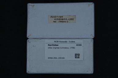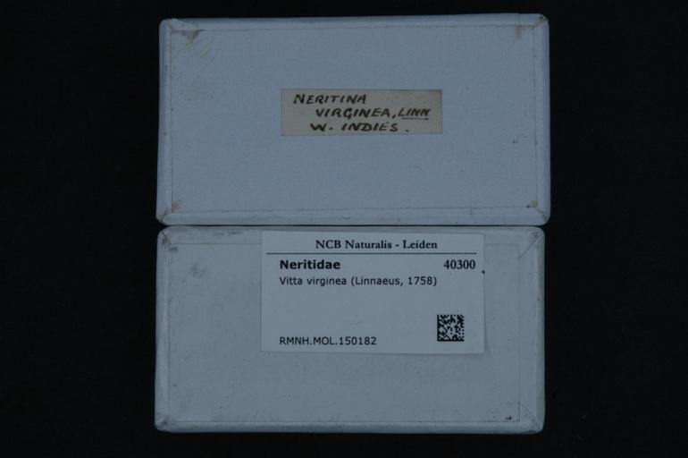 | Keywords: Naturalis Biodiversity Center - RMNH.MOL.150182 1 - Vitta virginea (Linnaeus, 1758) - Neritidae - Mollusc shell.jpeg artwork Dimensions artwork Document type Neritidae Vitta Individual count Infraspecific epithet Infraspecific rank Institution Naturalis Kind of unit artwork Kind of unit specimen shell Life stage Medium artwork Nomenclatural code Scale the width of the text on the species/QR-code label is 38 mm Occurrence ID page Other fields Other versions artwork Permission license Naturalis donation CC-0 Mollusca Publication location Scientific name Vitta virginea Linnaeus 1758 Scientific name authorship Linnaeus 1758 Source url http //bioportal naturalis nl Specific epithet virginea State or province Subject keywords artwork Subject keywords publication Title artwork Title publication Type status Uploaded with GWToolset Naturalis_Biodiversity_Center_-_RMNH MOL 150182_1_-_Vitta_virginea_ Linnaeus _1758 _-_Neritidae_-_Mollusc_shell http //medialib naturalis nl/file/id/RMNH MOL 150182_1/format/large Media donated by Naturalis Biodiversity Center Molluscs at Naturalis from the Rijksmuseum van Natuurlijke Historie Vitta virginea |